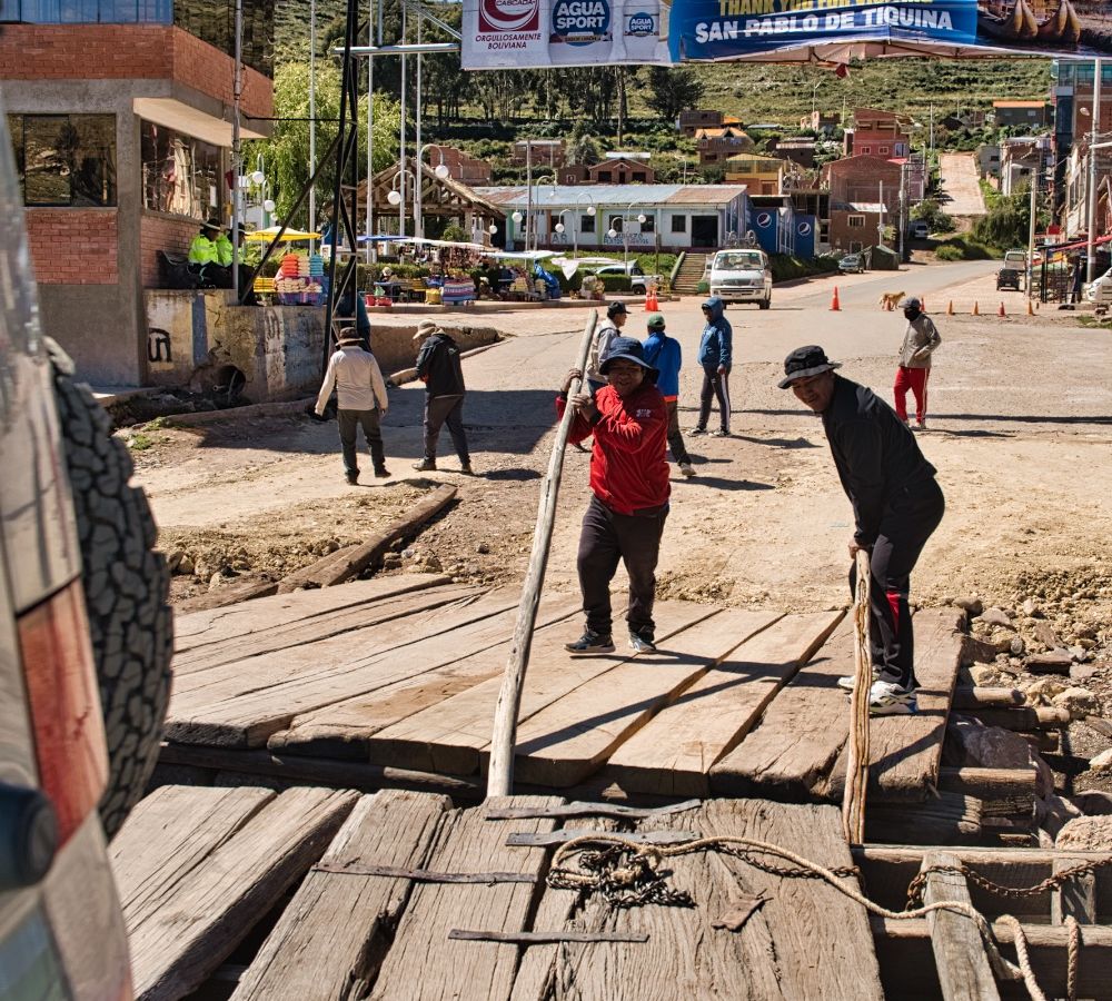 Puerto de Tiquina on Lake Titicaca is a ferry port where wooden ferries still bring everything from cars to trucks to the other side of the lake.