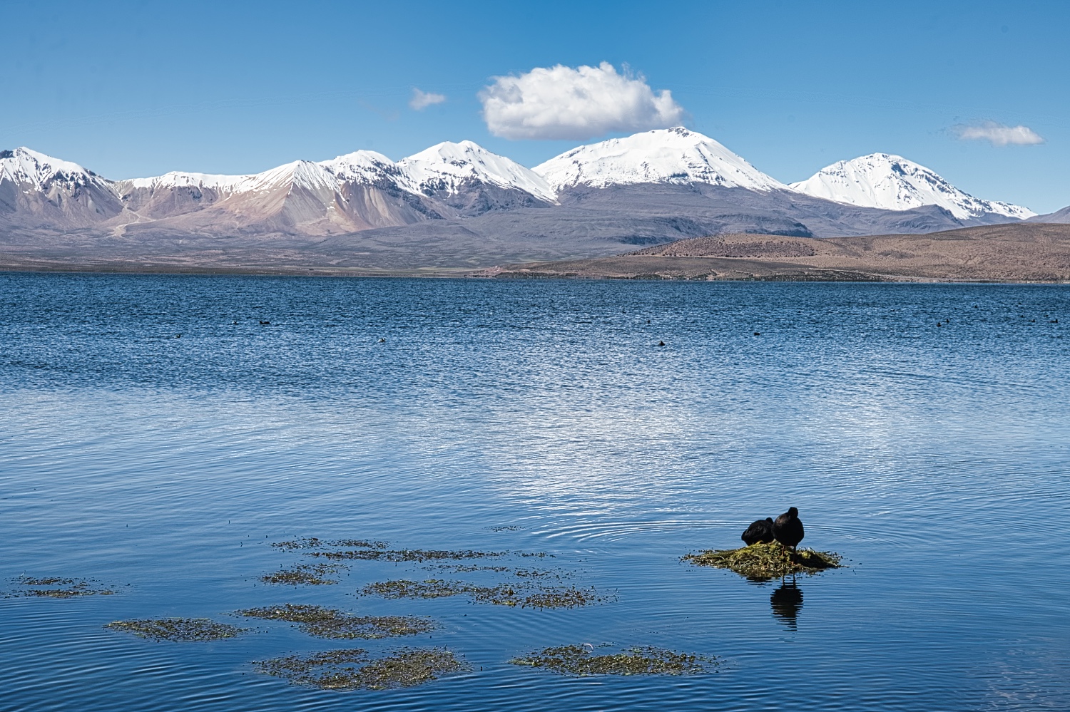 Ich hatte keinen Bock am nächsten Tag nach Bolivien zu fahren und gönnte mir einen Tag Entspannung am Lago de Chungara auf 4'562 m.ü.d.m. Die Landschaft im Parque Nacional Lauca war ein Kontrast für mich, hatte mir das nicht so vorgestellt. Ich machte Bilder bis zum Abwinken von Vulkanen, Seen, Flamingos, selbst Enten