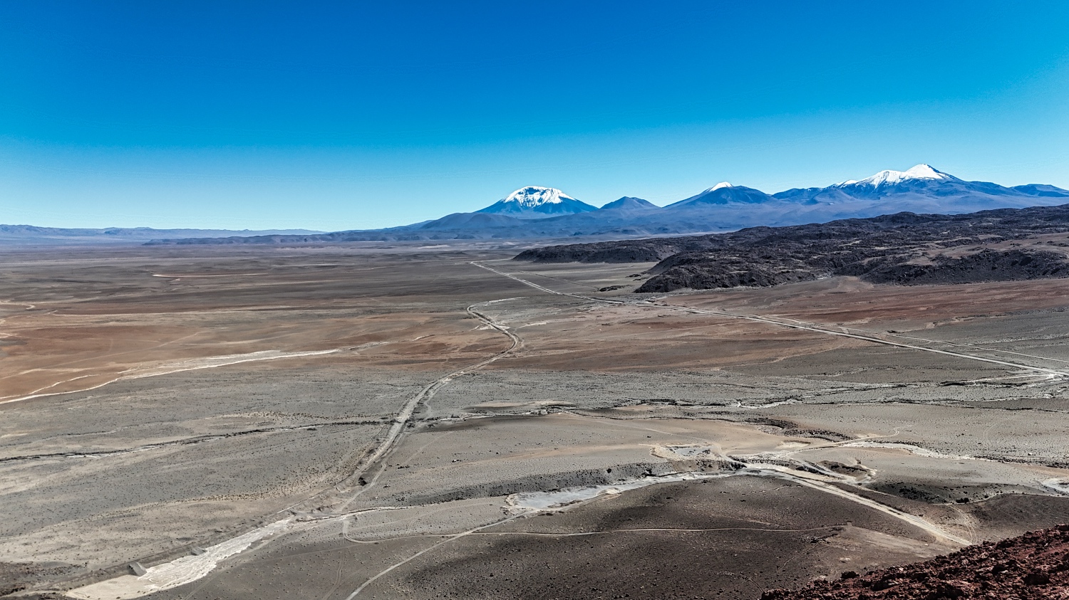 Ab besagter Abfahrt zum Paso Hito Cajón, auf 4'753 m.ü.d.m, ging es fast kerzengerade über ca. 40 km nach San Pedro de Atacama, auf 2'424 m.ü.d.m. Also ich hatte zuvor noch nie über 2'300 Höhenmeter auf 40 km zurückgelegt und auf halber Strecke, bei einem Fotoshooting des Volcan Licancabur und Volcan Juriques, stellte ich fest, dass meine vorderen Bremsen qualmten. Die verbleibende Strecke fuhr ich dann im 3. und 4. Gang langsamer runter und benutze die Bremsen weniger. Die LKWs fuhren in Schrittgeschwindigkeit runter und notgedrungen genau so schnell hoch.
