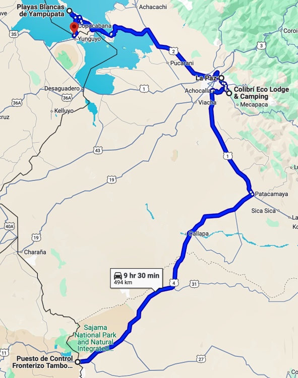 Entlang der RN4 sieht es nicht viel anders aus als in Jujuy, grüne Hügel, aber in Bolivien dominieren Vulkane mit weißen Gipfeln. Die Fahrt nach La Paz war zunächst nicht wirklich aufregend! In den Parque Nacional Sajama mit 4'300 Höhenmetern und noch höher, wollte ich eigentlich gar nicht rein.