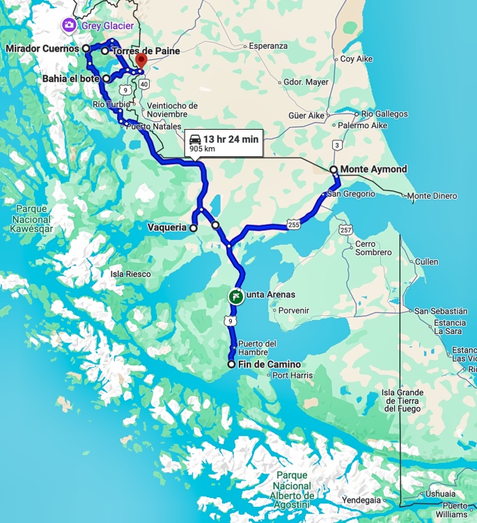 Also fuhr ich auf der R9 Richtung Süden, was hier nicht warm bedeutet. Den ersten brauchbaren Platz fand ich nach 50 km bei Bahía Carrera. Toller Blick auf die Magellanstraße und Feuerland in der Ferne.