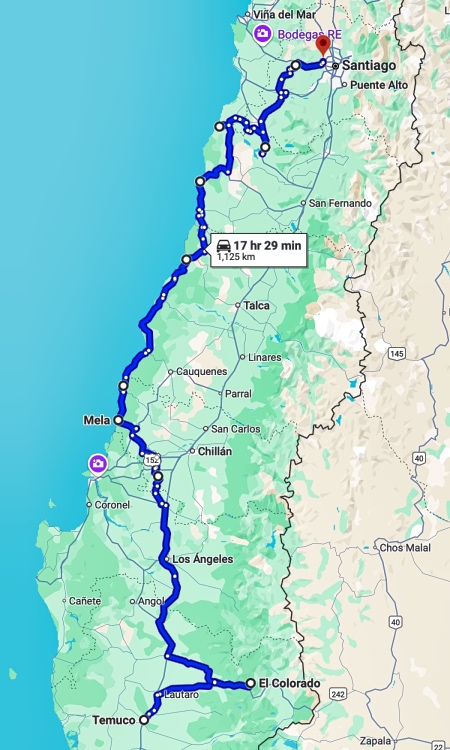 Ich weiß nicht, was ich mir dabei gedacht habe, aber der Salto del Laja war total überlaufen. Das war mit Abstand die größte Touristenattraktion in Südamerika bis jetzt. Für die 2,5 km im Ort habe ich 205 min gebraucht. Menschenmassen drängten sich an der Straße und am Wasserfall. Nicht mein Ding. Plan B war ein Platz in Ñipas am Rio Itata, ca. 100 km über Land. Die Landschaft war abwechslungsreich und ab La Cascada Liucura Bajo fuhr ich entlang eines Kanals durch Obst- und Gemüsefelder (N888). Im Nachhinein hätte ich hier bleiben sollen, in einem Wäldchen am Rio Itata bei den Einheimischen.