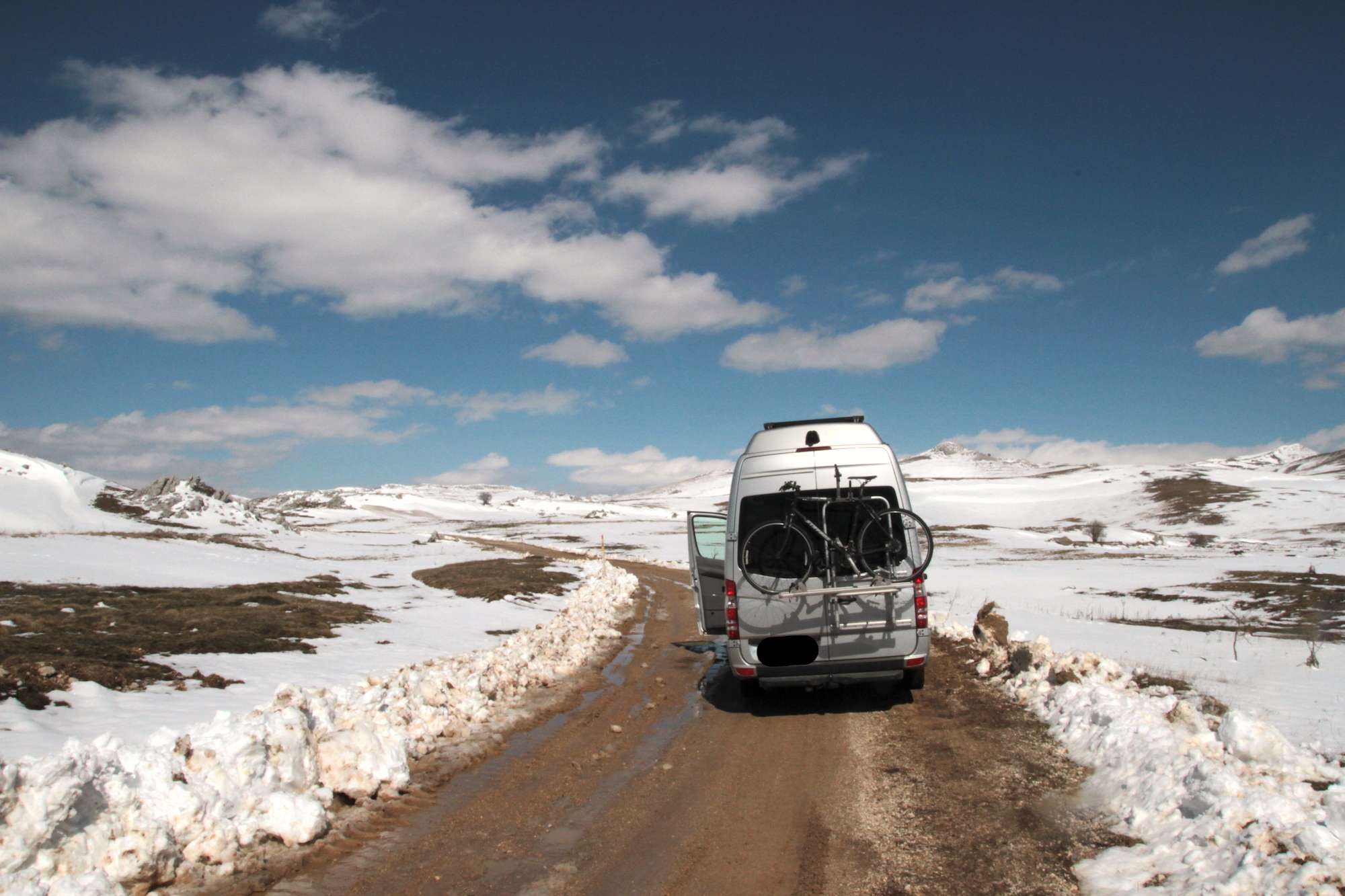 Ich suchte nach Stellplätzen, aber außer dem Weg war nichts schneefrei. Und meinen Sprinter im Schnee versenken wollte ich auch nicht.